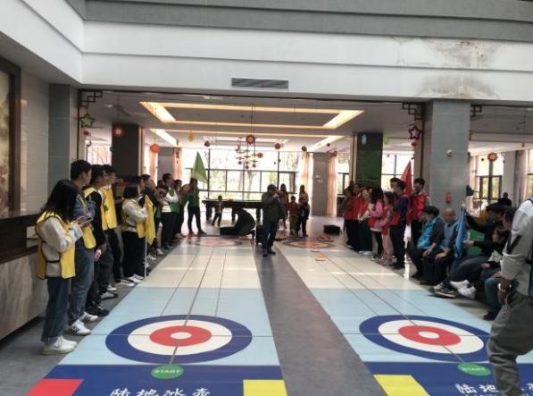 最后一個(gè)項目“旱地冰壺”,以小組為單位,在平滑的地面上進(jìn)行投擲的競賽項目。通過(guò)讓自己的壺停放在預設好的位置,或將對方球擊出,達到制勝的目的。這項競賽集智慧、戰術(shù)、判斷、技巧、把握時(shí)機的能力為一體,充分發(fā)揚了雙方隊員誠實(shí)信任的體育精神。