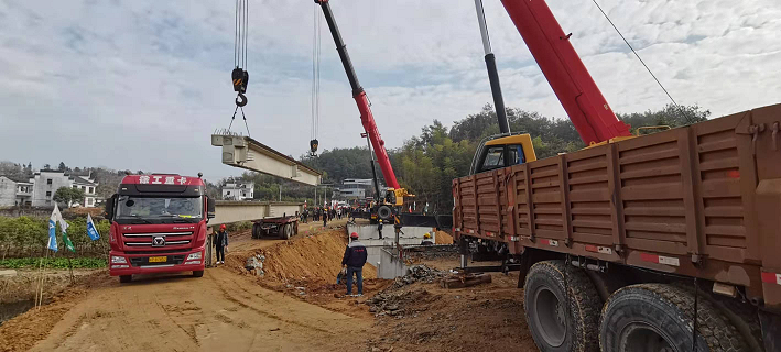 2021年12月15日上午10點(diǎn)55分,隨著(zhù)最后一片混凝土梁板穩穩地落在橋梁支座上,歙縣跳石至呈坎農村道路改建工程鮑家橋梁板吊裝工作順利完成。