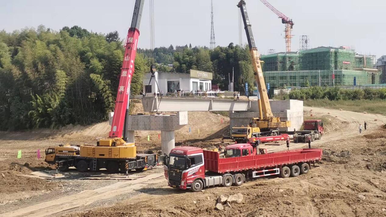 2022年9月27日上午10點(diǎn)20分,鐘山大橋完成了第一片梁板吊裝工作。下午17點(diǎn)左右,鐘山大橋完成了2號橋墩與3號橋墩之間的梁板安裝任務(wù)。