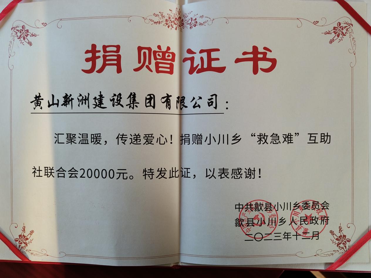 12月8日上午,來(lái)自17位愛(ài)心企業(yè)家和愛(ài)心人士齊聚歙縣小川鄉參加“救急難”互助社聯(lián)合會(huì )成立暨慈善捐贈儀式,公司黨支部書(shū)記李惠明代表黃山新洲建設集團有限公司向互助聯(lián)合會(huì )捐款2萬(wàn)元。